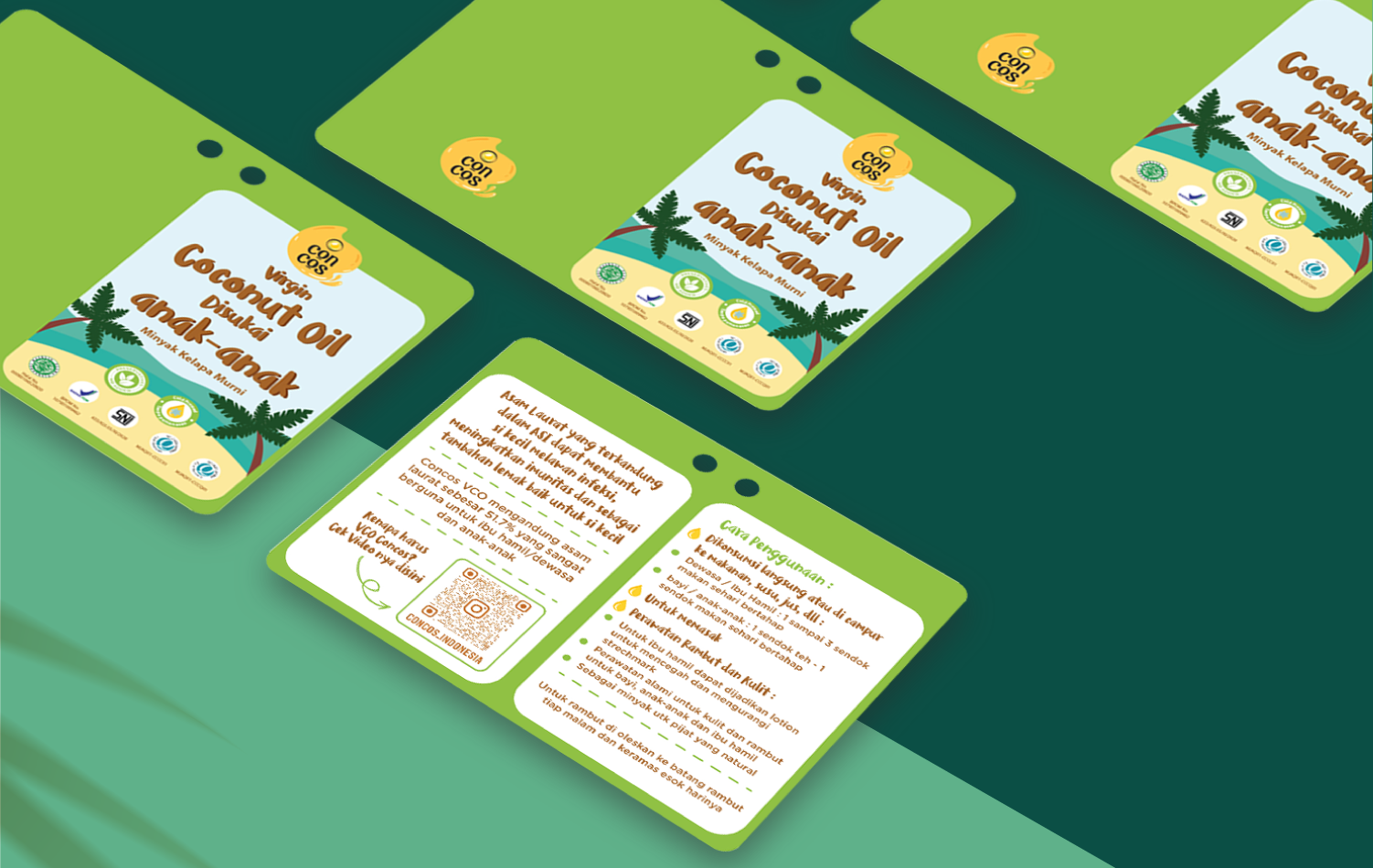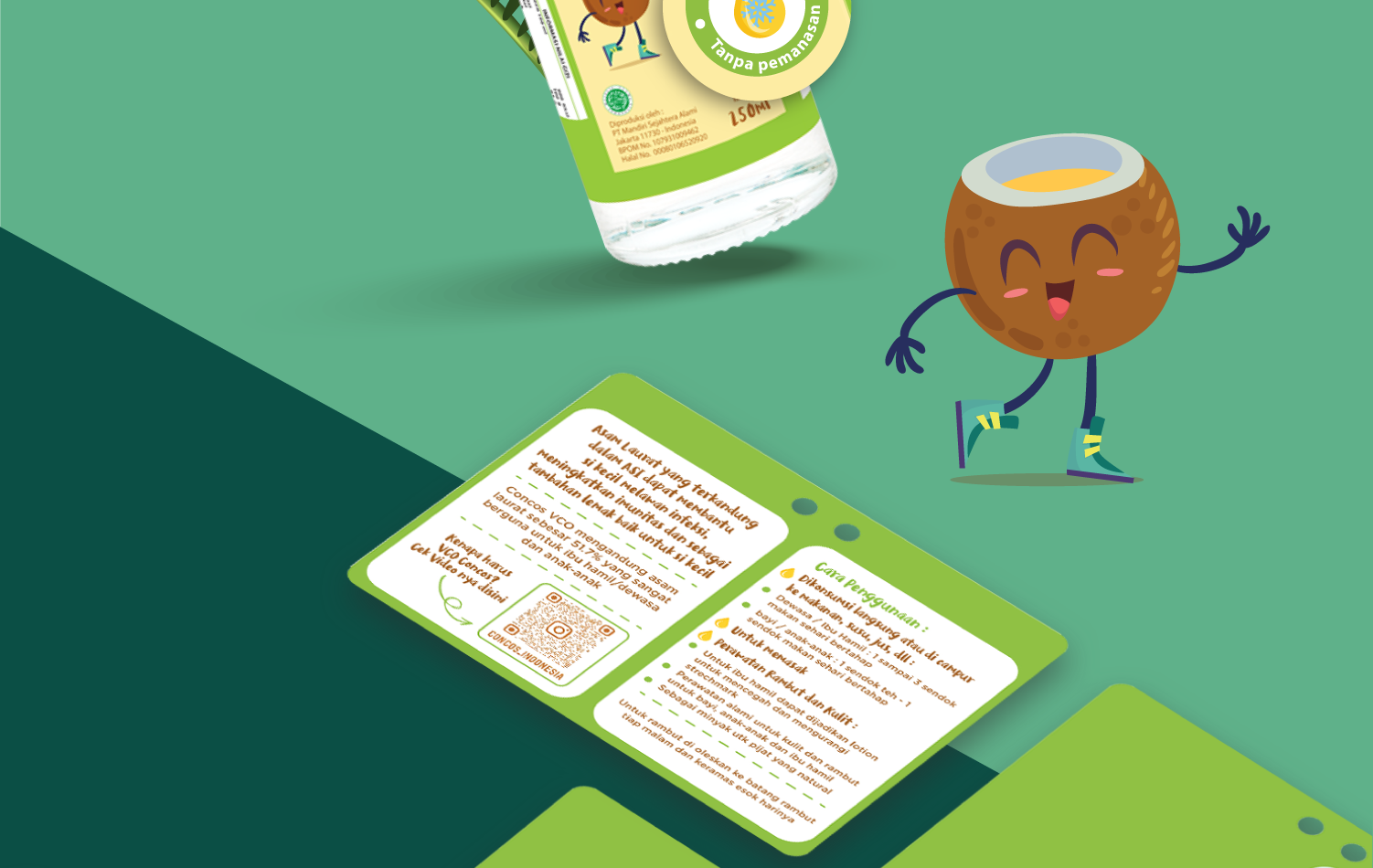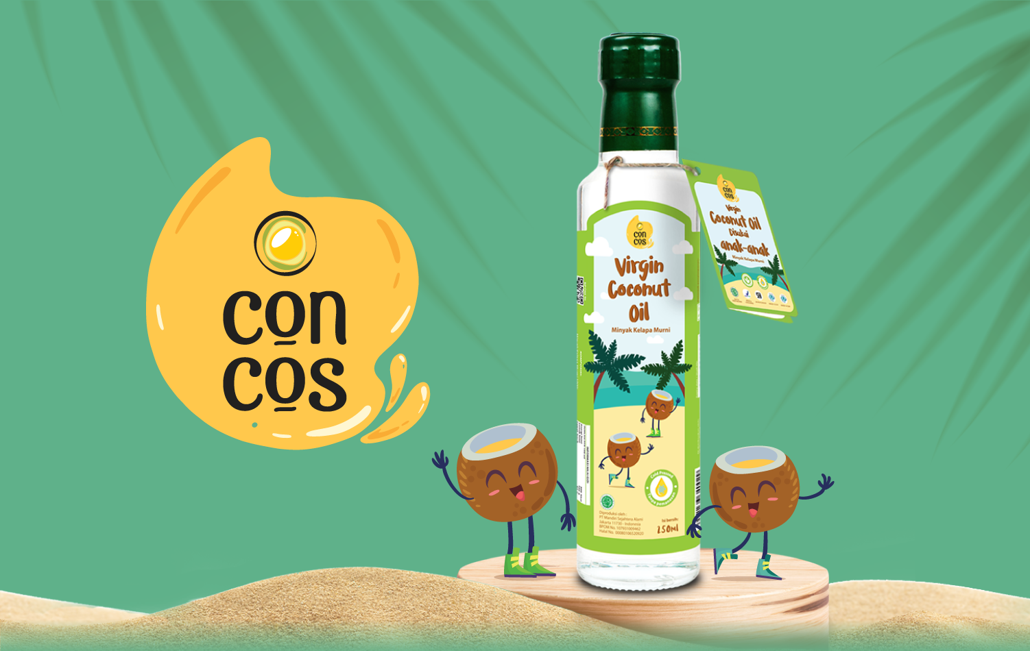 The packaging is designed to give the impression that the product is produced to have a high quality and safe to be consumed by children. The coconut, the main ingredient, becomes the star in this design as it was illustrated with a gentle smile as if it was saying "hello" to buyers.